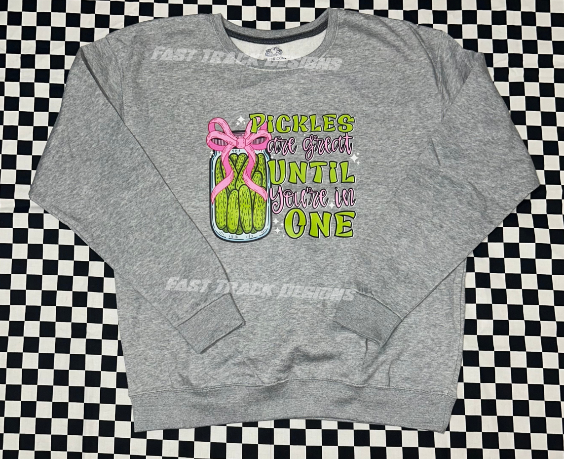 Pickles are great until you're in one direct to fabric print on a grey Fruit of the Loom crewneck.